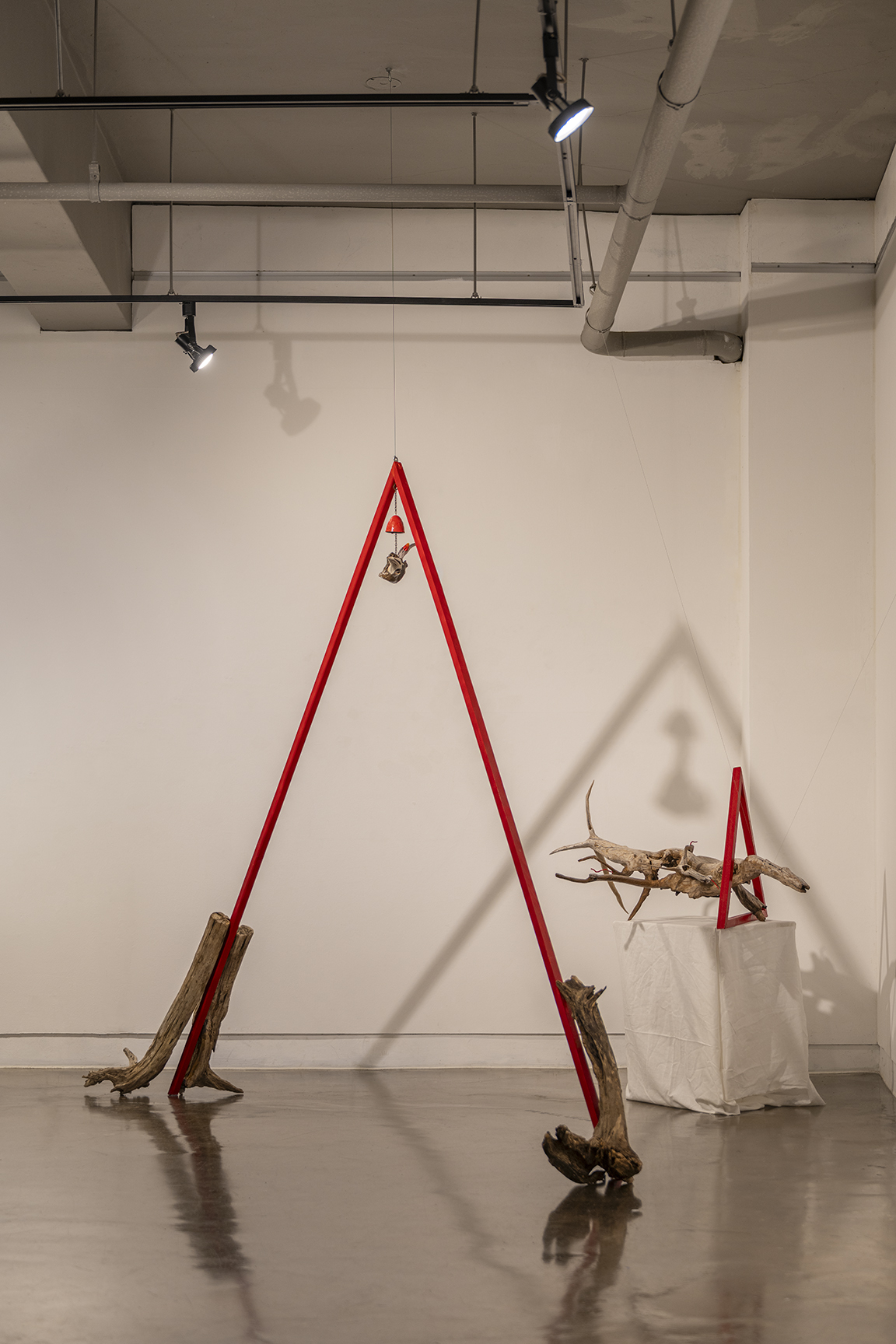 〈걷는 자의 초상, 2025〉은 정삼각형 구조를 띠는 설치 작업이다. 두 개의 변은 다리를 형상하고, 나머지 한 변은 땅이 되어 걷는 두 다리가 지면과 맞닿는 순간 하나의 삼각형을 이룬다. 237cm에 이르는 다리는 신체의 비례를 넘어선 스케일로 세워지며, 그 아래에는 발의 형상을 한 나무 밑둥이 놓여 움직임의 흔적을 드러낸다.