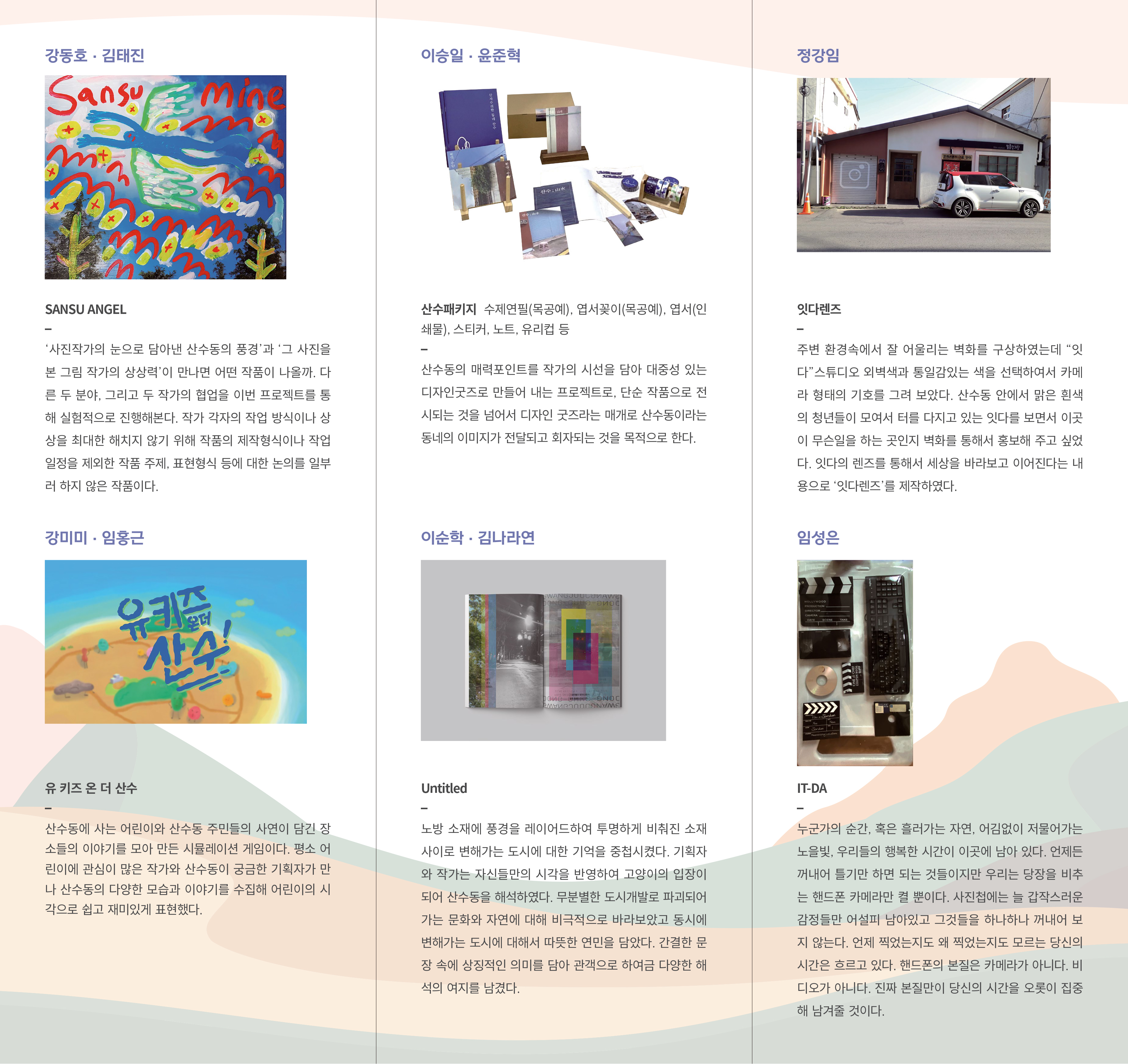 2020년 '광주 동구 아트포인트 살롱' 프로젝트 결과 보고 작품으로 산수동에 사는 어린이와 산수동 주민들의 사연이 담긴 장소의 이야기들을 수집하여 만든 시뮬레이션 게임이다. 게임 속 장소 9