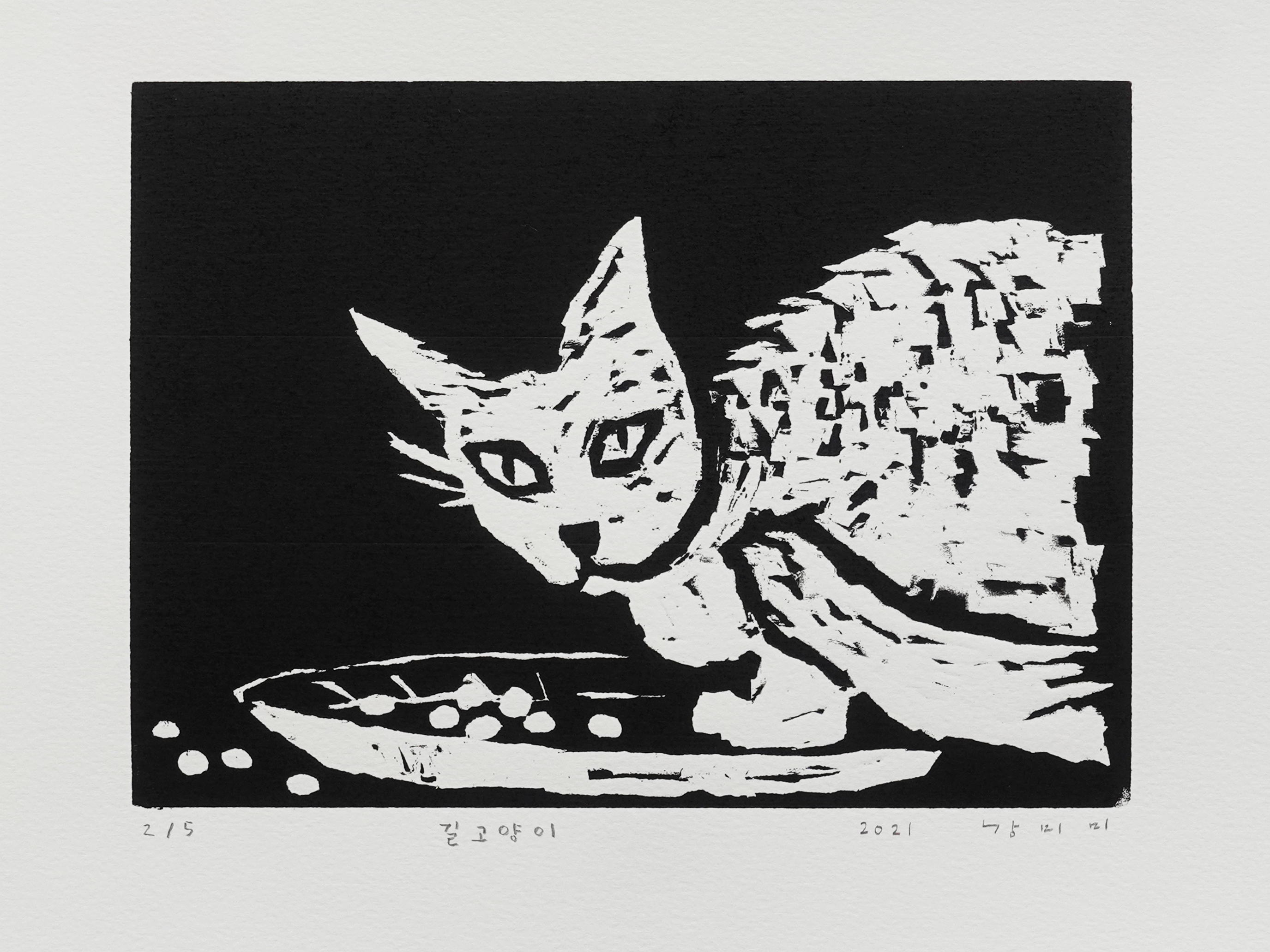 2021년 대인예술시장 레지던시 프로그램 참여 작가로 활동하며, 시장의 고양이들과 눈이 마주치는 순간이 많았다. 일회용 접시에 누군가 준 사료를 먹고 있는 길고양이의 모습을 목판화로 담았다.