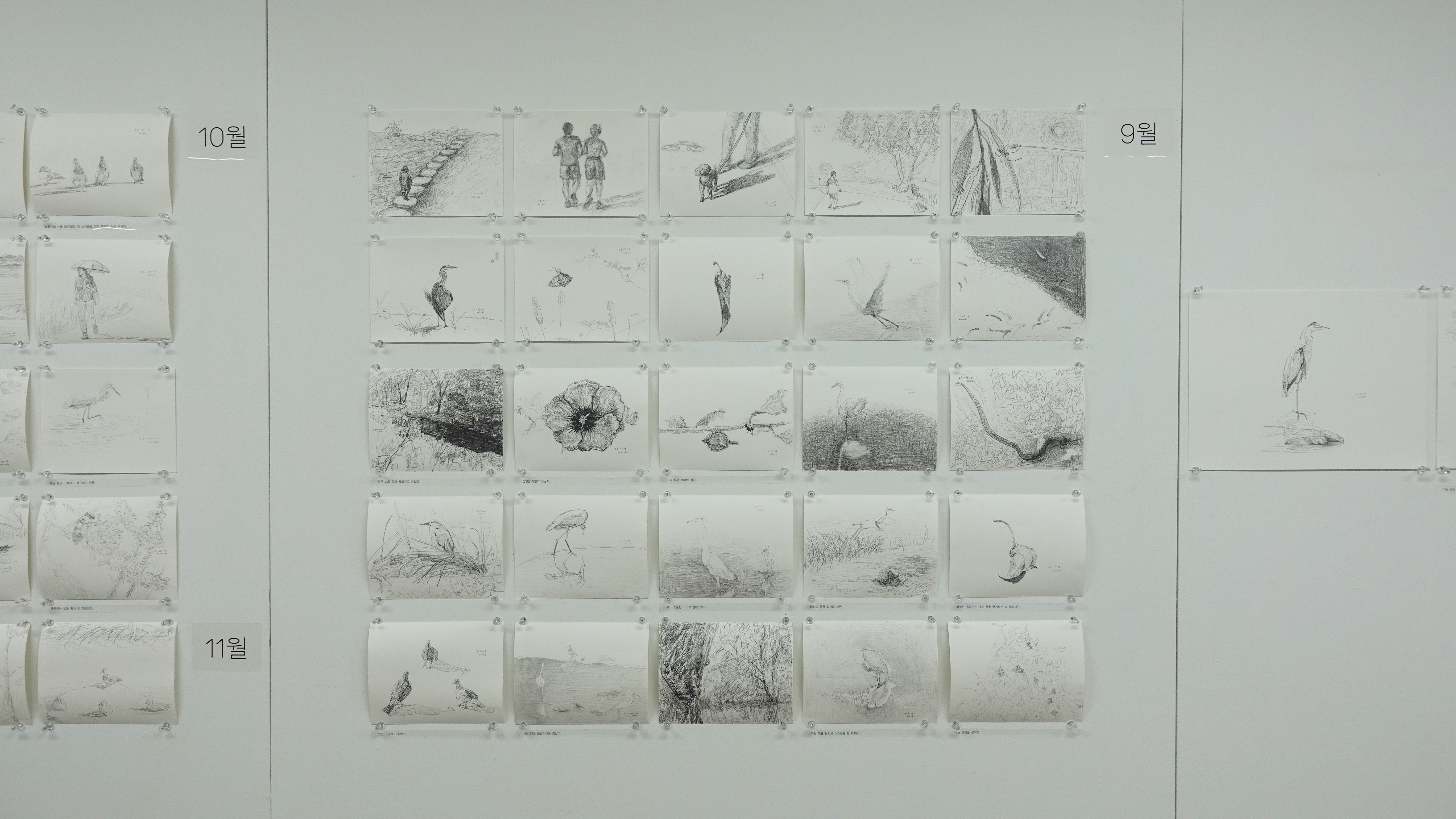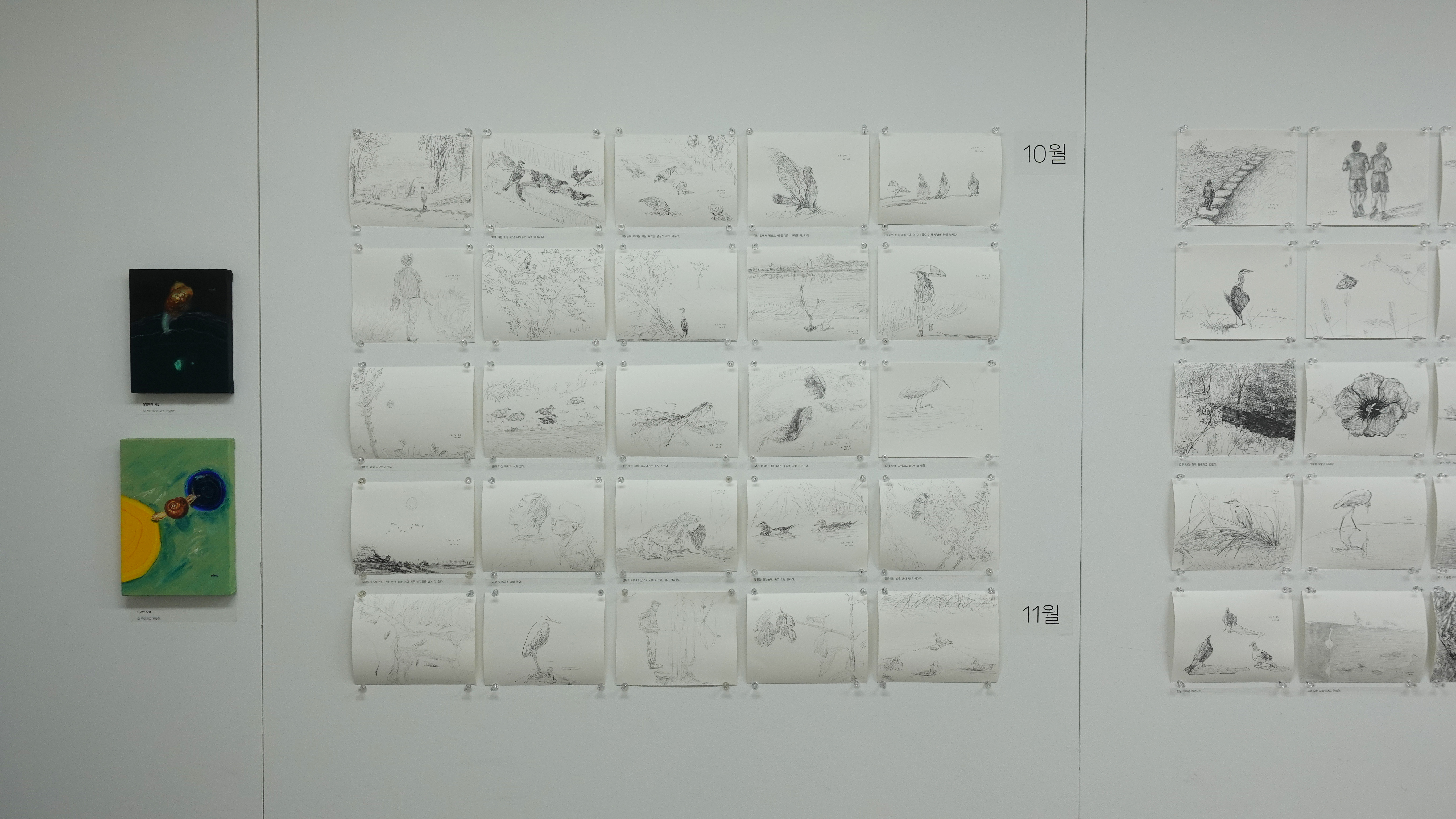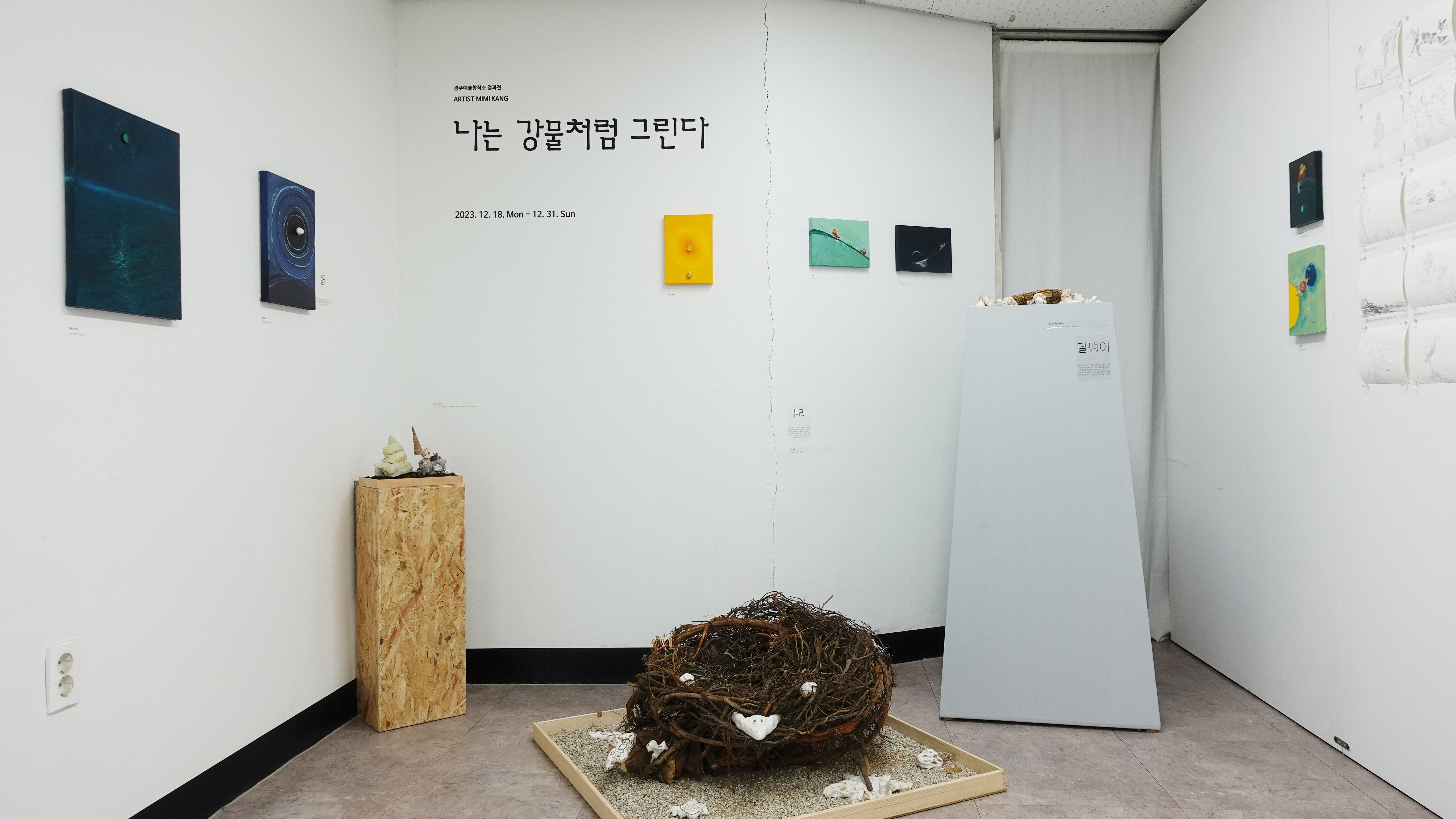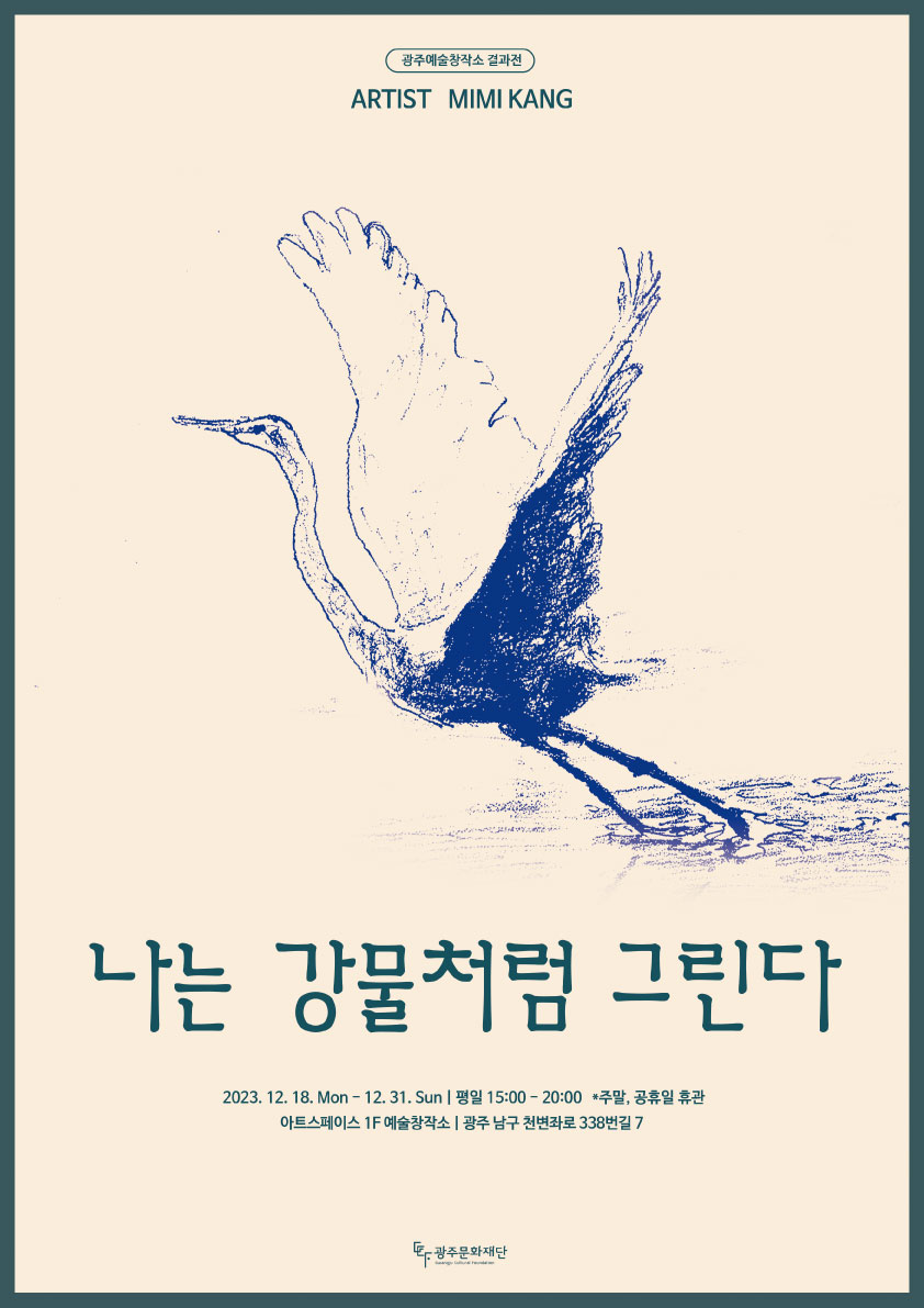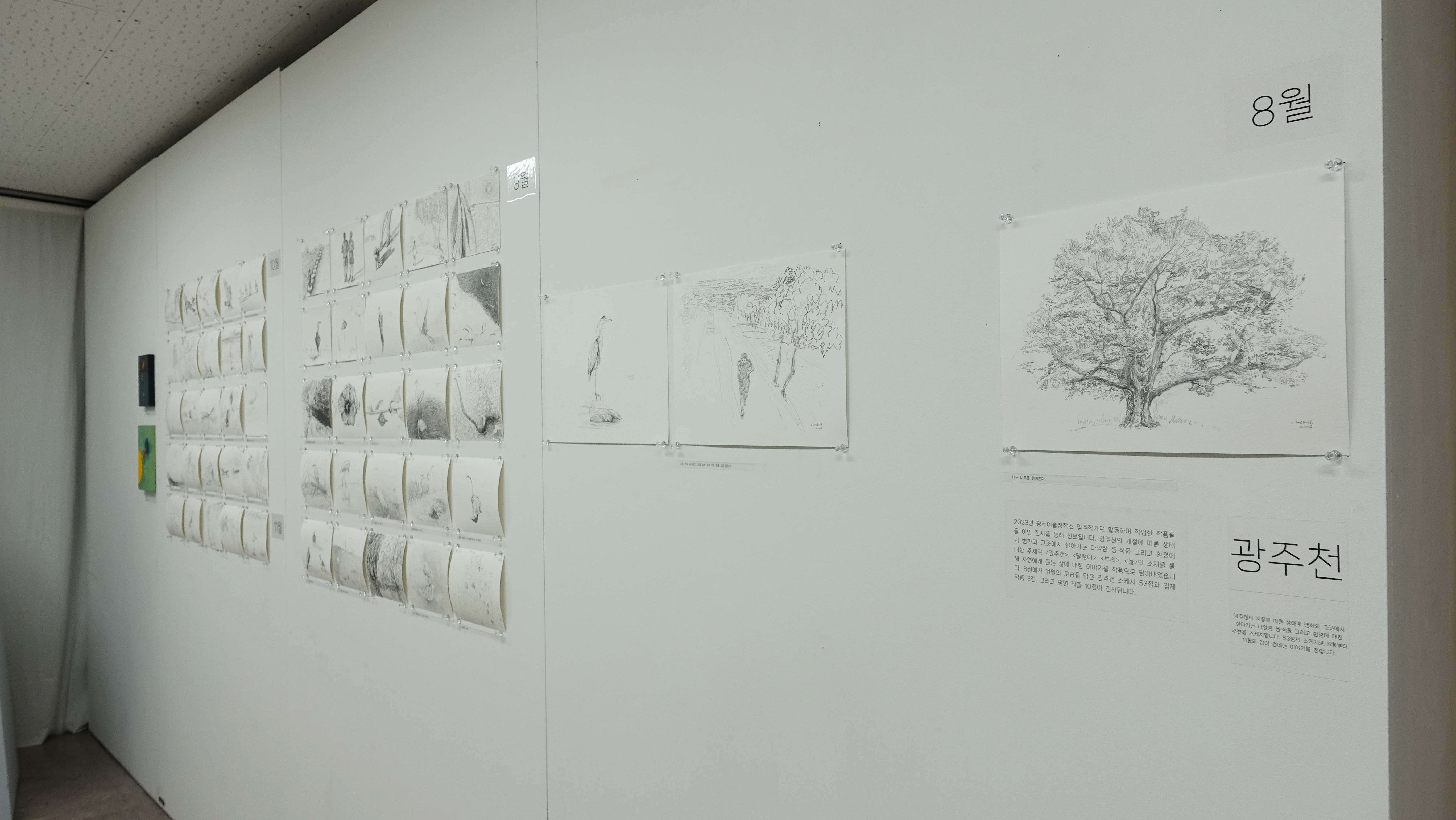 2023년 광주예술창작소 입주작가로 활동하며 작업한 작품들을 이번 전시를 통해 선보인다. 광주천의 계절에 따른 생태계 변화와 그곳에서 살아가는 다양한 동·식물 그리고 환경에 대한 주제로 <광주천>, <달팽이>, <뿌리>, <돌>의 소재를 통해 자연에게 듣는 삶에 대한 이야기를 작품으로 담아내었다. 8월에서 11월의 모습을 담은 광주천 스케치 53점과 입체 작품 3점, 그리고 평면 작품 10점이 전시된다.