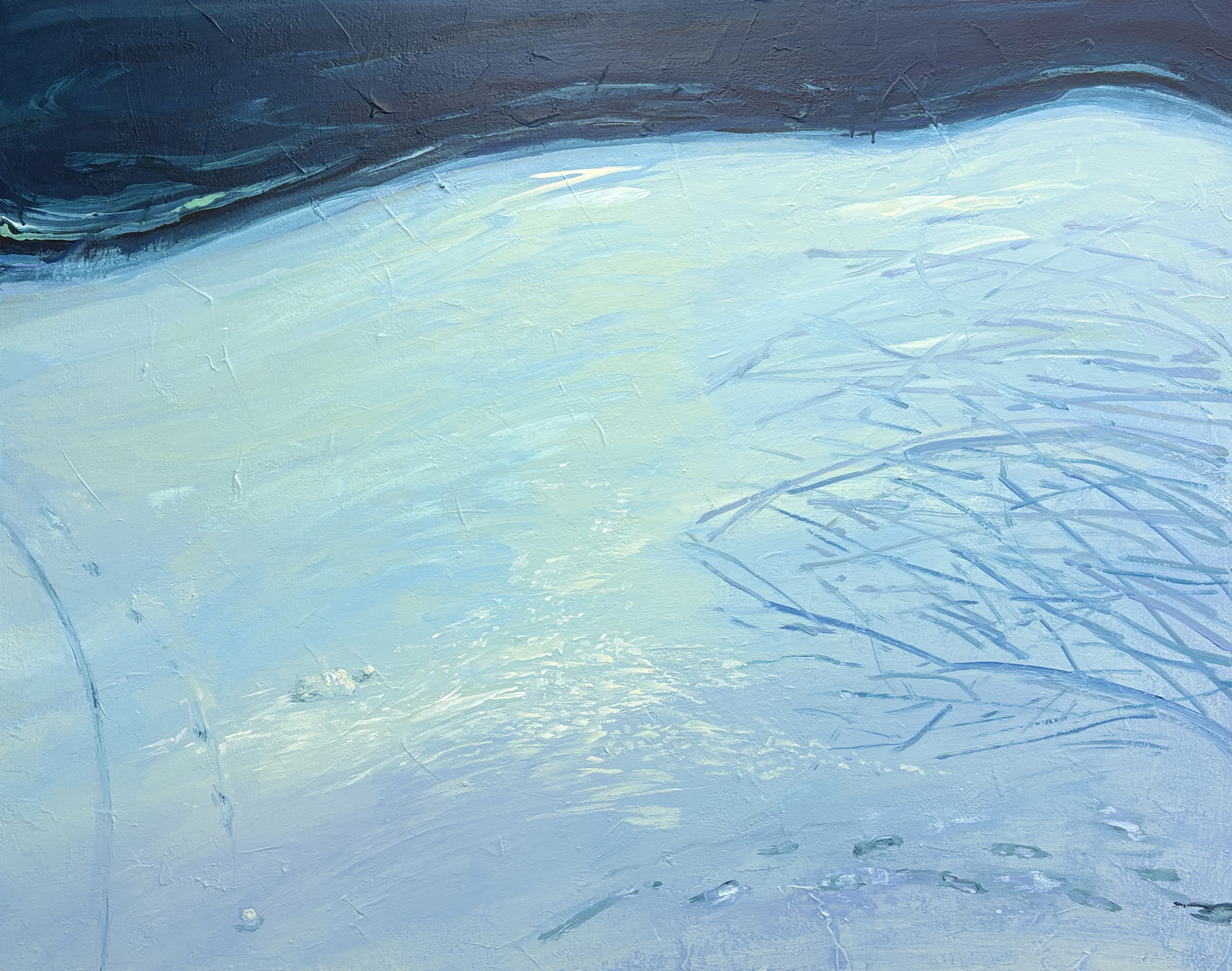 〈사라질 흔적, 2025〉은 지금은 또렷이 남아 있으나 곧 사라질 눈 위의 자국을 잔잔한 긴장 속에 담은 작업이다. 햇빛과 시간, 바람에 의해 서서히 흐려질 그 흔적은 존재의 순간성과 소멸의 예감을 동시에 품고 있다. 반짝이는 빛 속에서 이미 사라짐을 향해 나아가고 있는 상태, 그 예정된 소멸의 감각이 아릿하게 전해지기를 바란다.