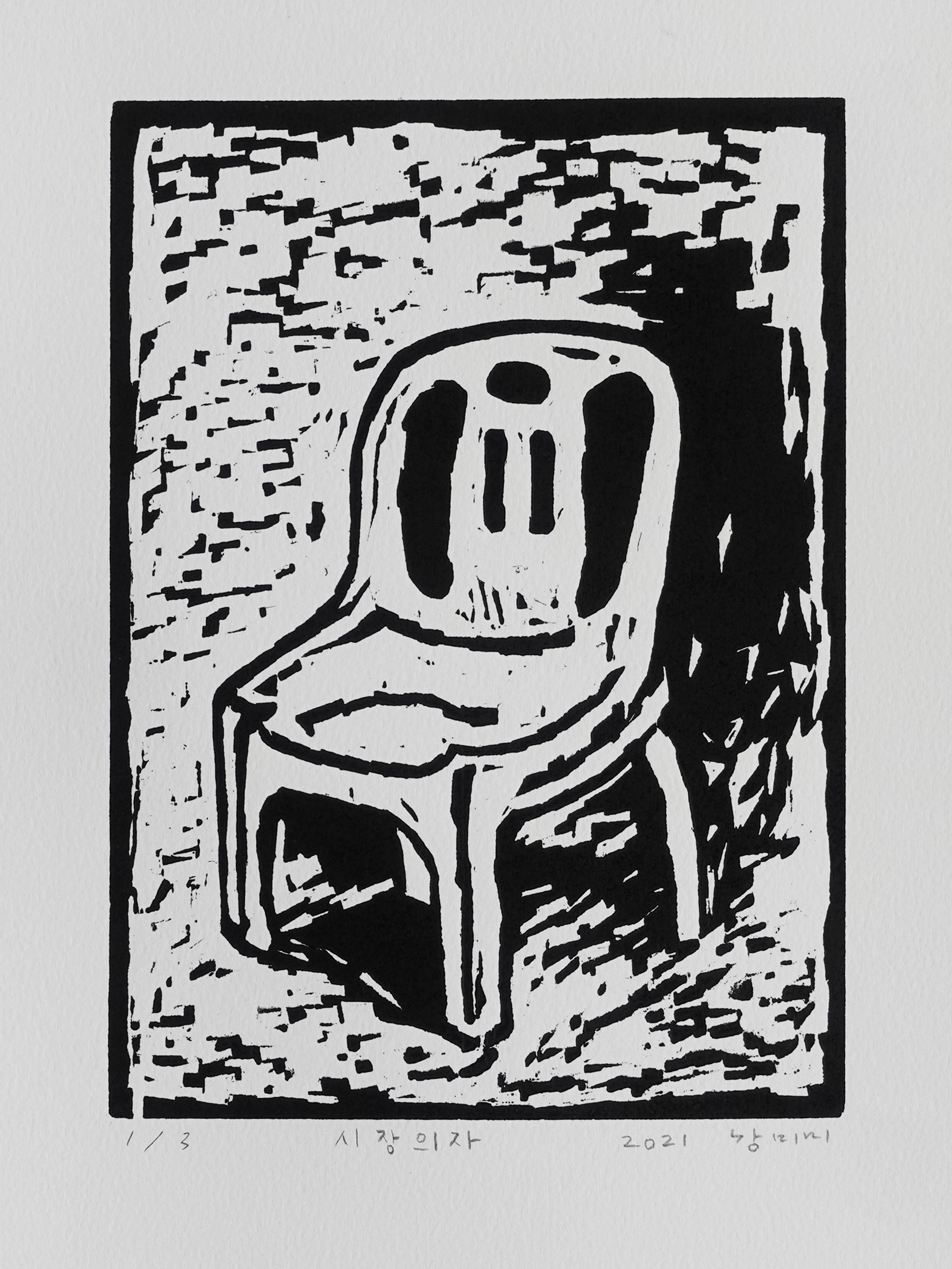 <시장의자-A market chair(ed. 1 of 3)>, 2021, Woodcut, 25.2×18.2cm(종이사이즈 24×32cm)