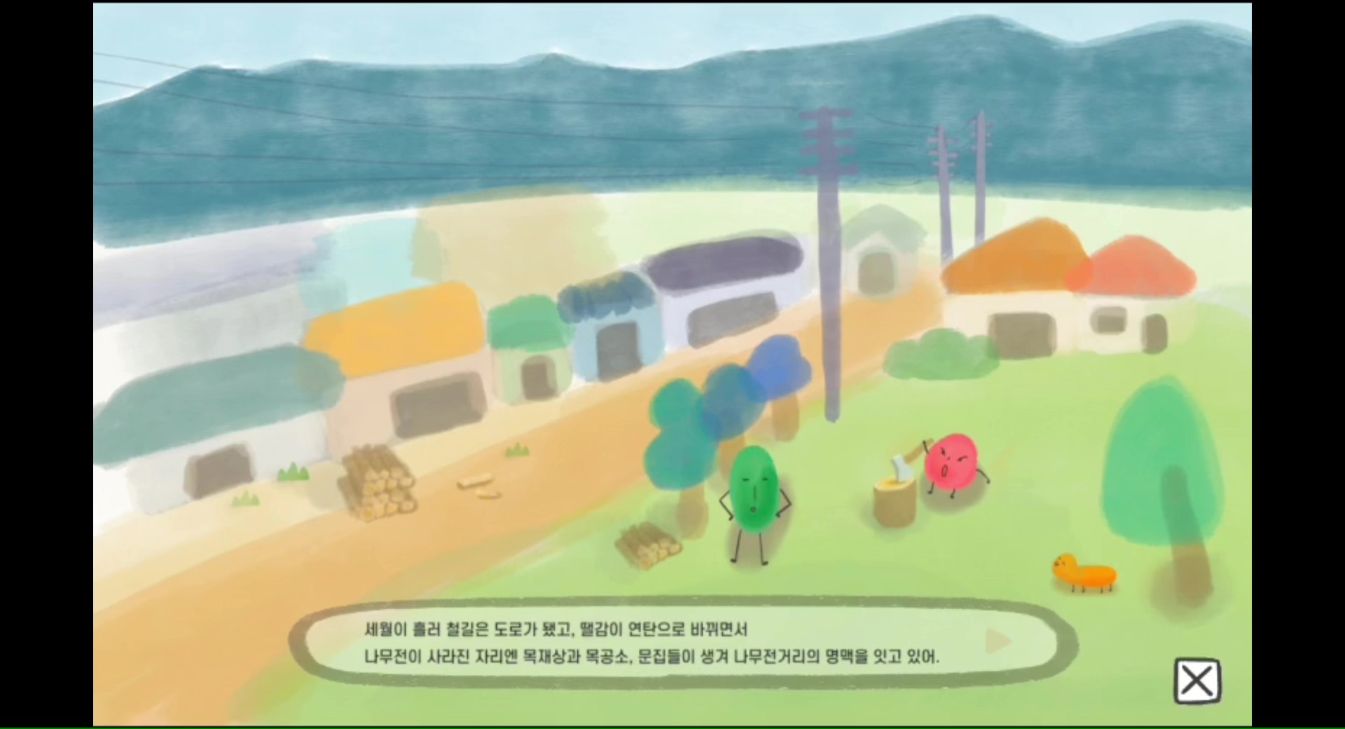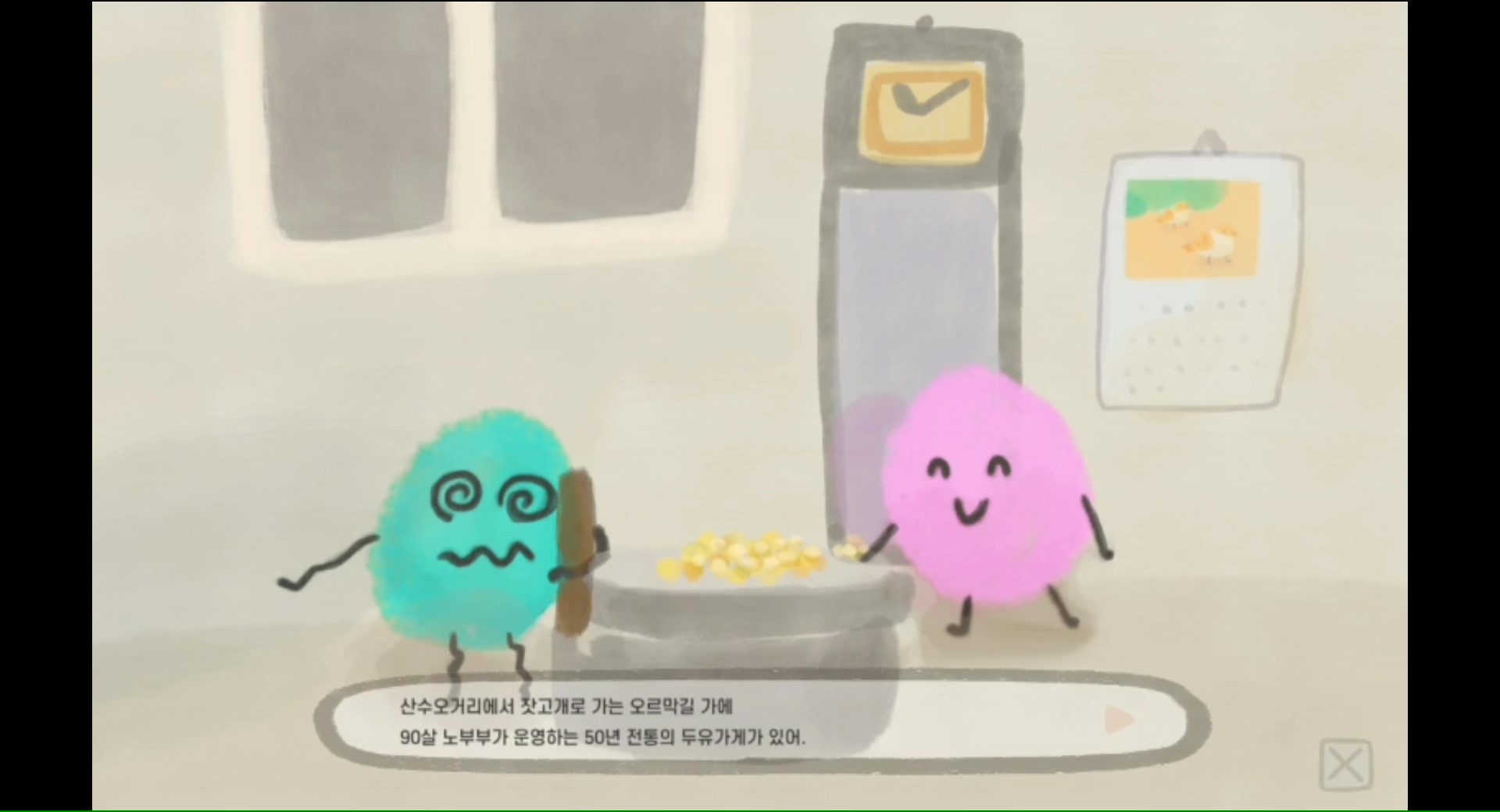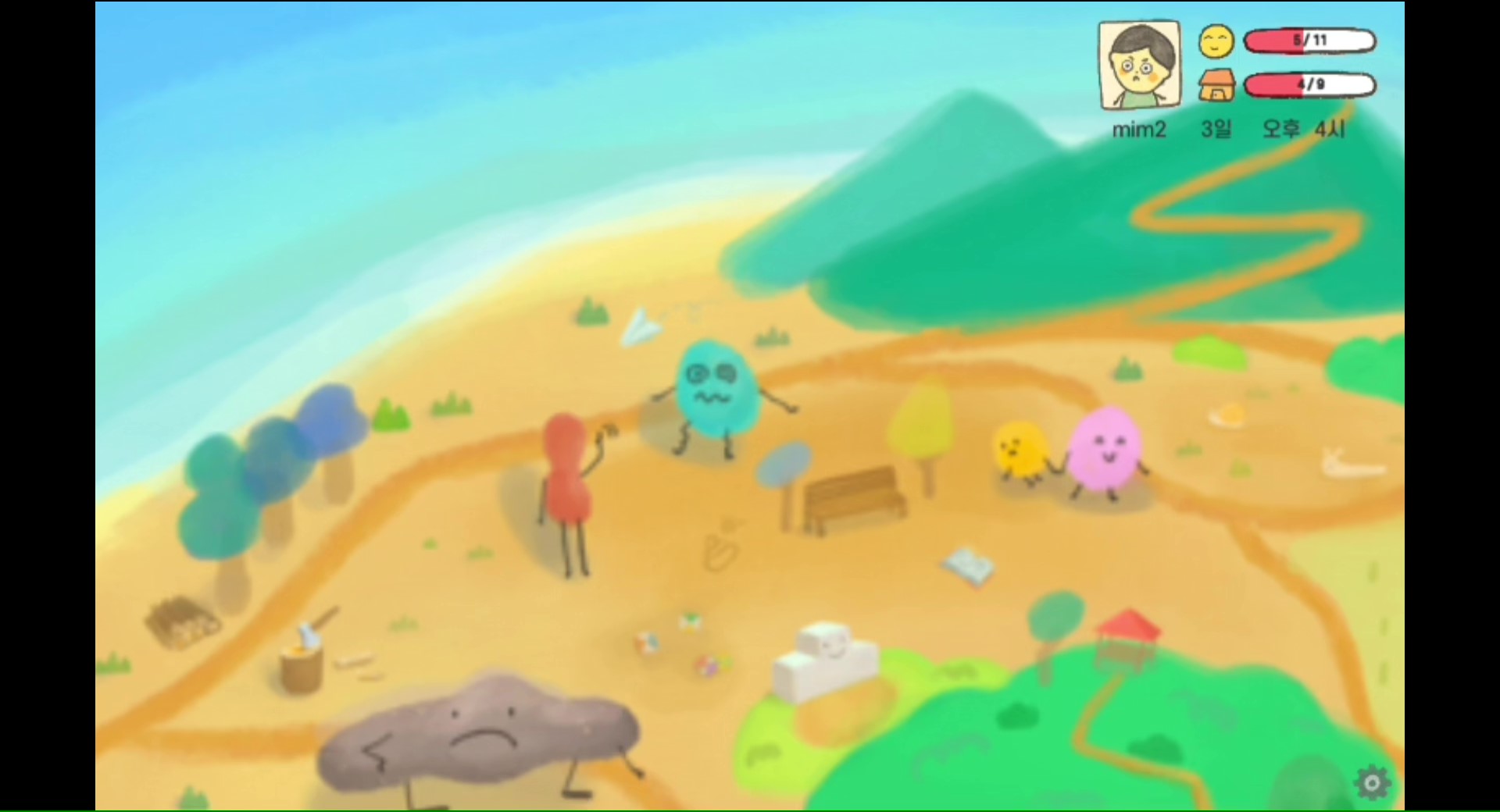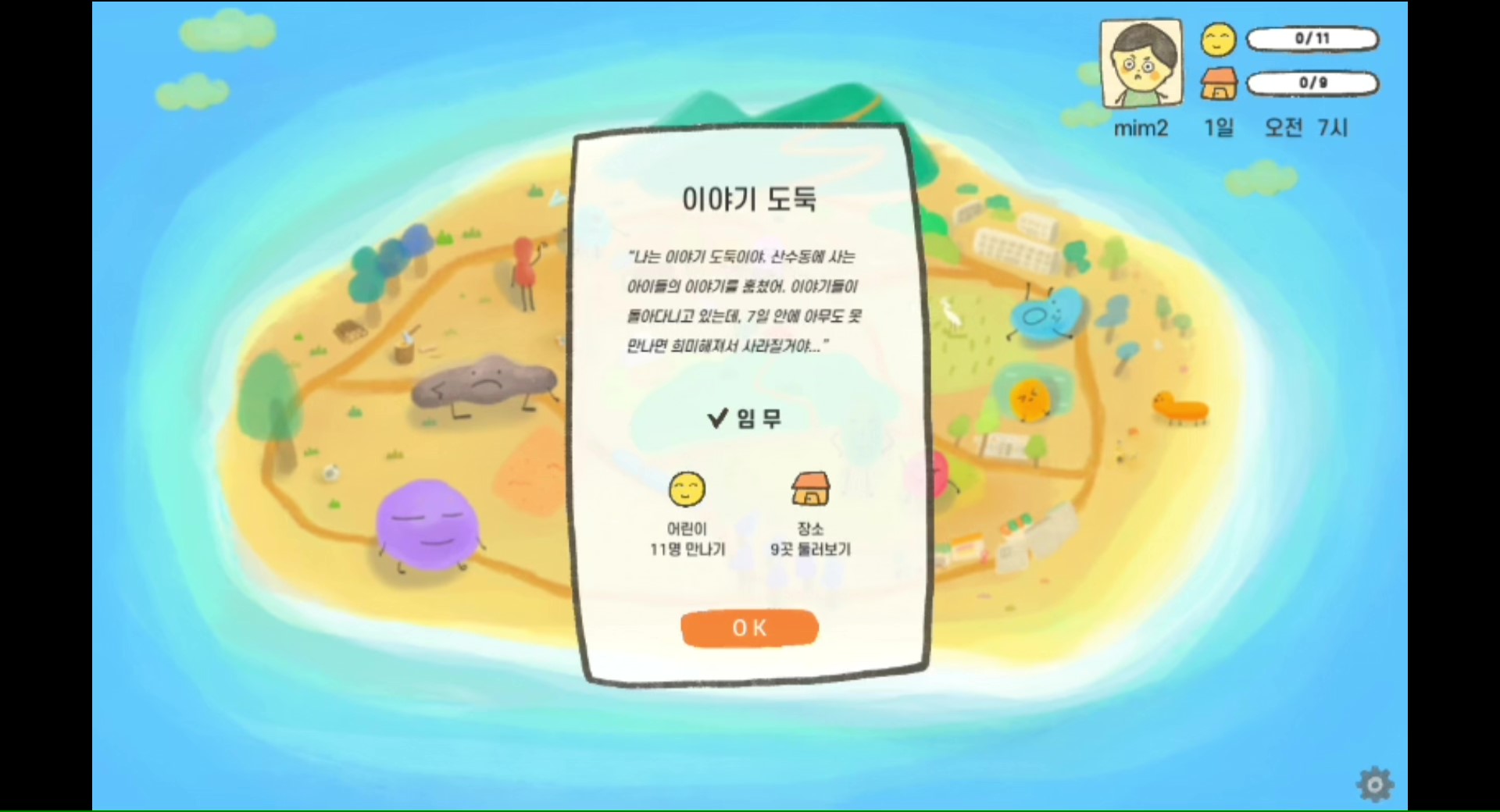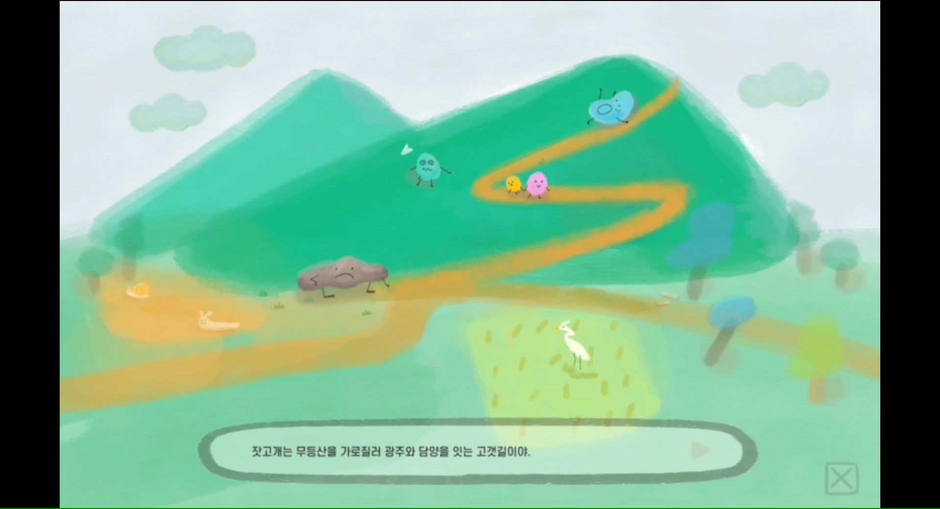 2020년 '광주 동구 아트포인트 살롱' 프로젝트 결과 보고 작품으로 산수동에 사는 어린이와 산수동 주민들의 사연이 담긴 장소의 이야기들을 수집하여 만든 시뮬레이션 게임이다. 게임 속 장소 9곳과 동그란 아이들 11명을 만나며 산수동만의 특별한 비밀을 발견할 수 있다. 지금의 아이들, 또는 아이였던 어른들을 위한 게임이다. (게임 제작 : 일러스트레이터 강미미 / 기획자 임홍근 / 개발자 오태경)