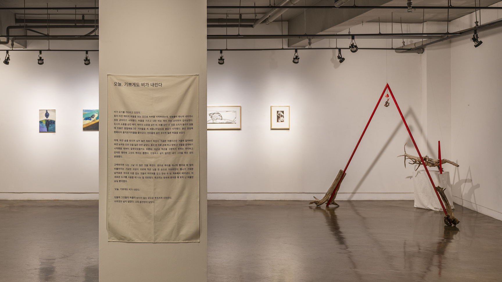 《오늘, 기쁘게도 비가 내린다》전은 단순한 작품 배치가 아닌, 하나의 서사가 이어지는 동선으로 구성되었다. 비가 오기 전의 정적 상태부터, 도구의 흔적이 드러나는 중간 단계, 마지막으로 소리와 형상이 옅어지며 남는 침묵과 여백까지 이어진다. 관람객은 단순히 작품을 감상하는 것이 아니라 이 흐름을 직접 체험하며 ‘사라진 흔적’과 ‘남아 있는 감각’이 결합한 공간에 머무르게 된다. 작가는 여백을 활용하여 관람자가 자신의 속도로 걸으며 감정과 경험을 치환할 수 있게 설계하였으며, 이 동선 체험은 자연을 대하는 태도를 반추하는 기회로 기능한다.