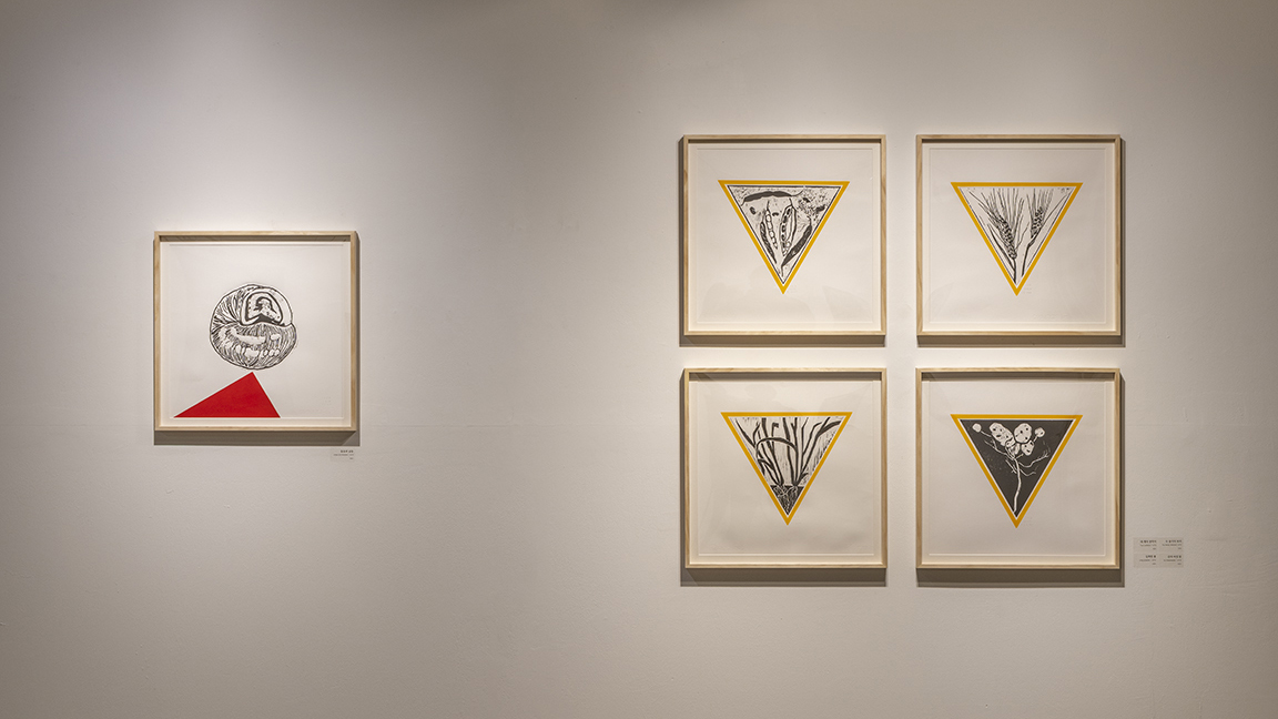 〈버섯 주의, 2025〉는 증식하는 생명성을 경고의 형식으로 제시한 목판화 작업이다. 서로 다른 상태의 세 버섯은 성장의 리듬을 드러내고, 삼각형의 경고 테두리는 그 통제 불가능한 힘을 암시