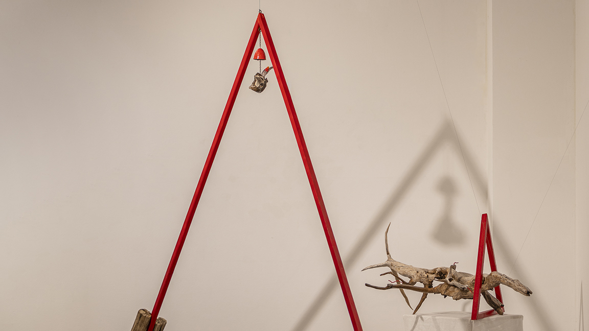 〈걷는 자의 초상, 2025〉은 정삼각형 구조를 띠는 설치 작업이다. 두 개의 변은 다리를 형상하고, 나머지 한 변은 땅이 되어 걷는 두 다리가 지면과 맞닿는 순간 하나의 삼각형을 이룬다. 237cm에