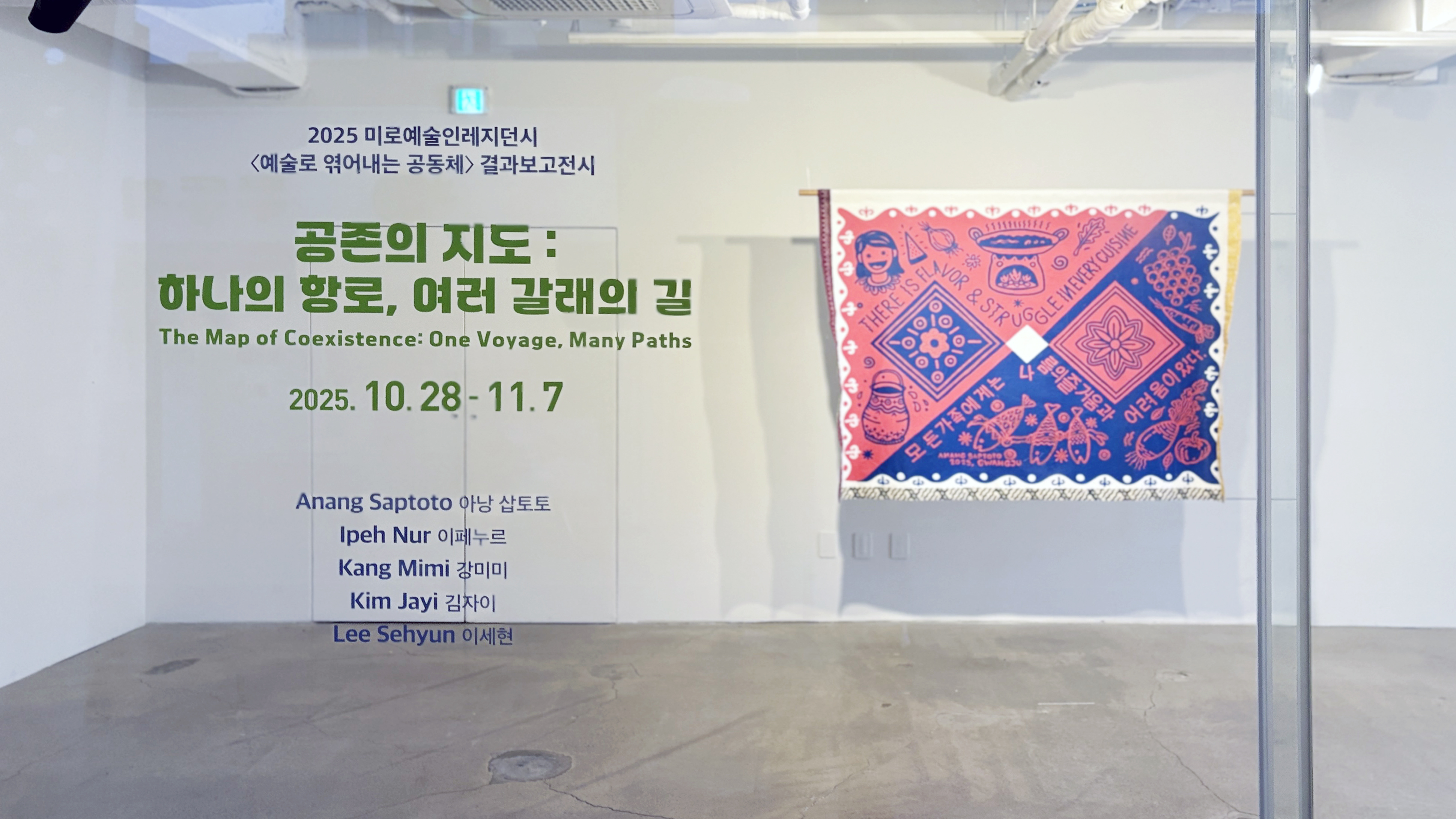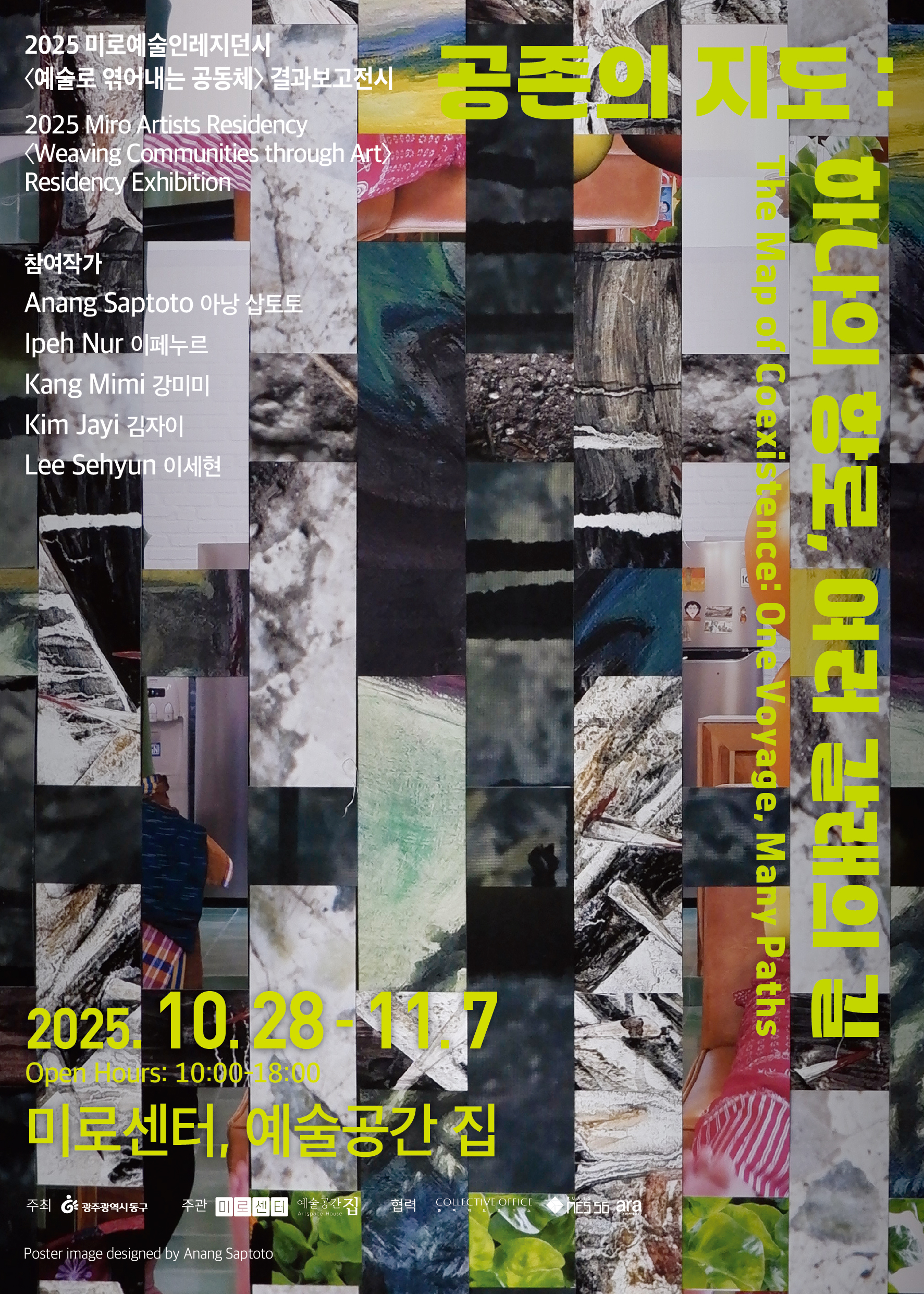 '예술로 엮는 공동체' 레지던시에 참여한 국내외 다섯 명의 작가는 각자의 역사와 환경, 사회적 맥락 속에서 예술을 통해 공존의 가능성을 탐색한다. 서로 다른 시선과 여정이 교차하고, 현재의 시간과 역사적 시간, 공간이 맞닿으며 하나의 항로 위에서 다채로운 길들이 그려진다. 이 전시는 각기 다른 길 위에 서 있는 우리가 결국 하나의 항로를 향해 나아가고 있음을 보여주는 계기가 되고자 한다. 전시명 <공존의 지도 : 하나의 항로, 여러 갈래의 길>은 다섯 작가 각자의 시공간이 하나의 항로로 모여드는 과정을 드러내는 전시이다. 지역을 기반으로 왕성한 활동을 보여주고 있는 김자이, 이세현, 강미미 작가를 비롯, 인도네시아 현대미술의 중심에 있는 ‘루앙매스56’과 ‘아라컨템포러리’의 소속으로 활동하고 있는 아낭 삽토토Anang Saptoto, 이페 누르Ipeh Nur 2인이 함께 한다.